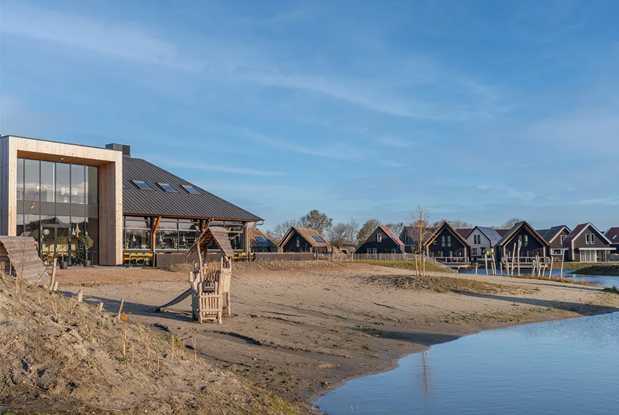Ontvangstgebouw vakantiepark met receptie, winkel, restaurant, zwembad en slaapvertrekken voor personeel.