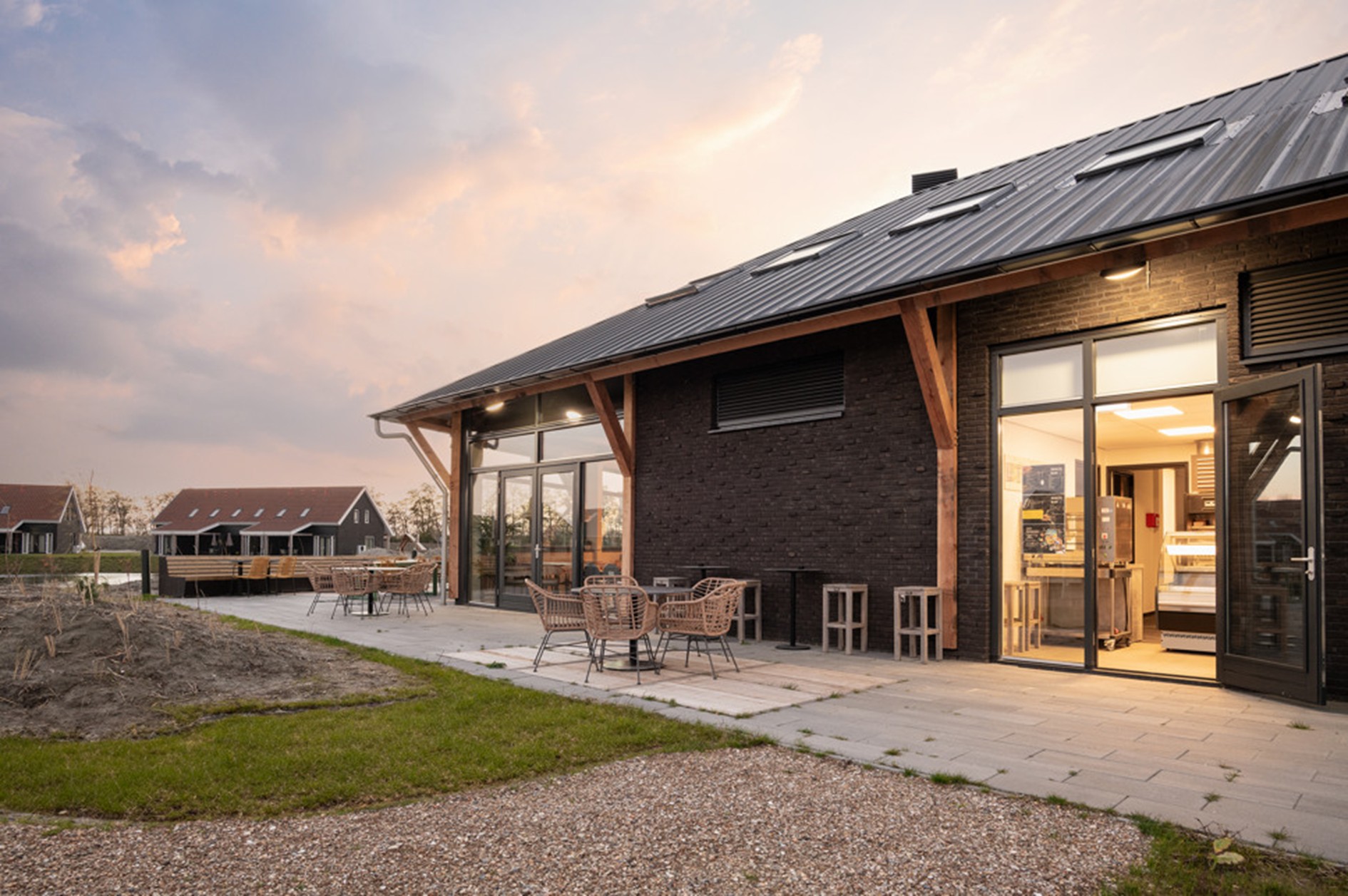 Ontvangstgebouw vakantiepark met receptie, winkel, restaurant, zwembad en slaapvertrekken voor personeel.